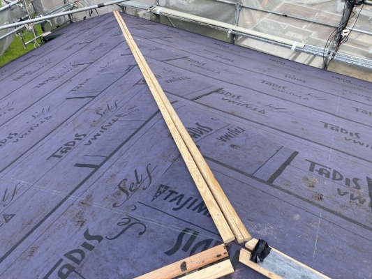 この写真は既設の屋根の上に新しい防水シートを張っているところです。